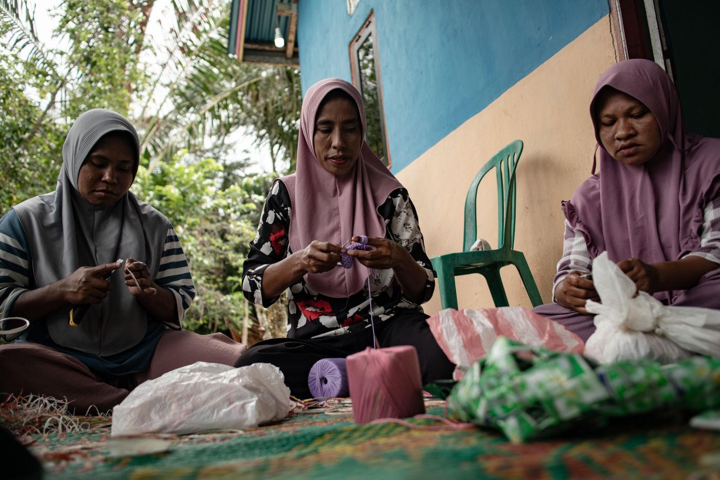 Setiap akhir pekan, tujuh perempuan duduk di teras rumah milik Nuruja. Di atas tikar, berjejer bahan-bahan seperti benang wol, gunting, jarum, pisau kecil, serta tumpukan plastik bekas. Mereka bekerja sambil bercerita dan saling menyemangati. Ada yang sedang menggunting, ada yang merajut, ada pula yang mulai menganyam.